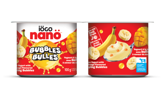 The new iÖGO Nanö Bubbles : Bursting with mini Mango flavoured Popping Bubbles in a creamy banana yogourt.
